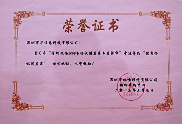 2015年深圳机场“优质协议供应商”证书