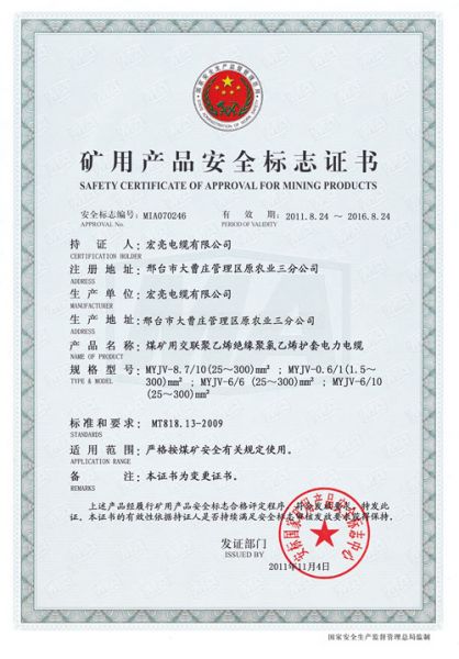 矿用产品安全标书证书